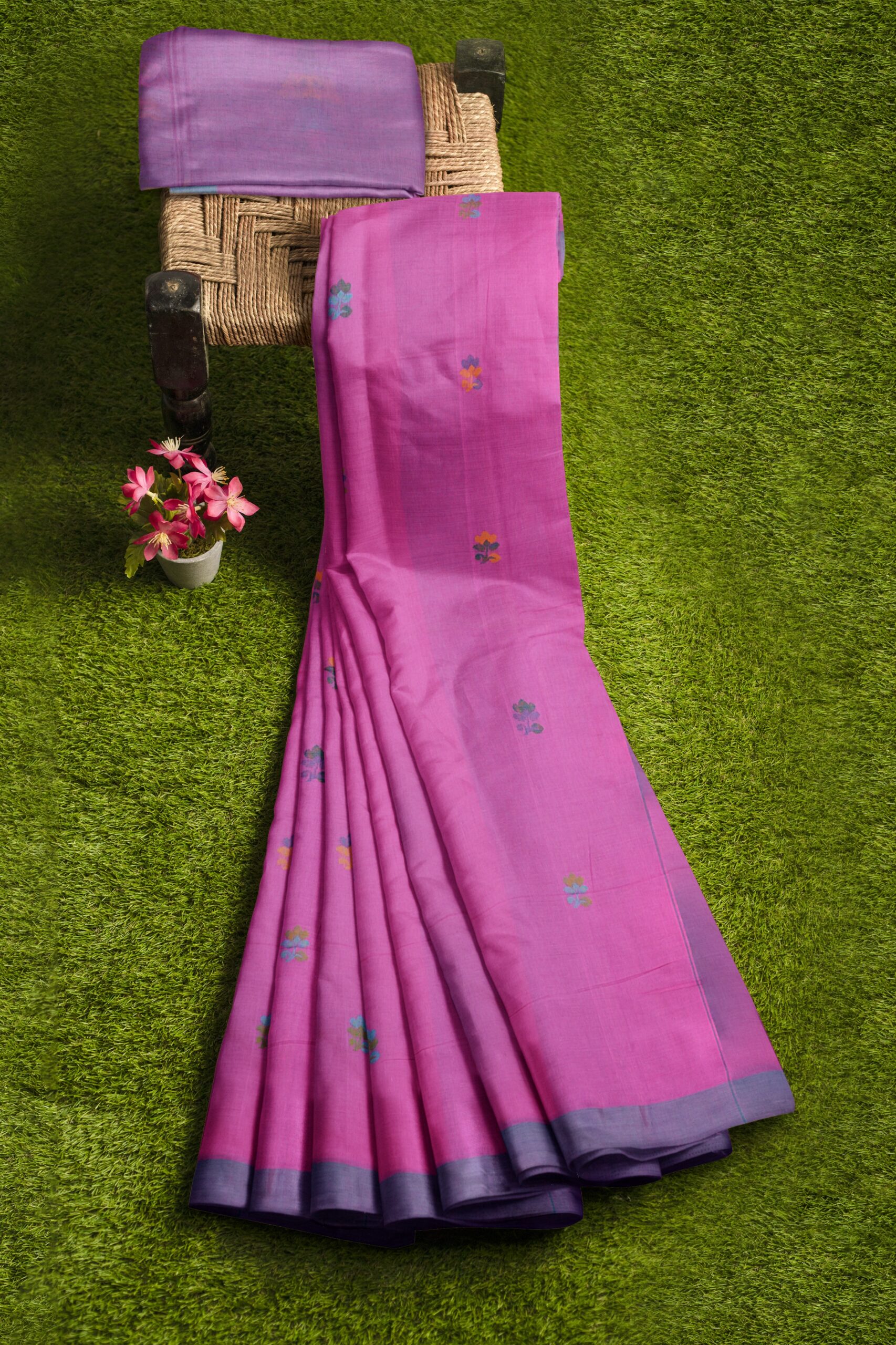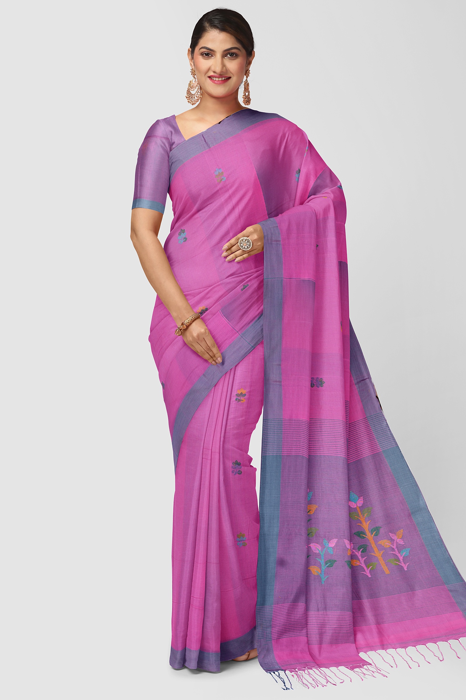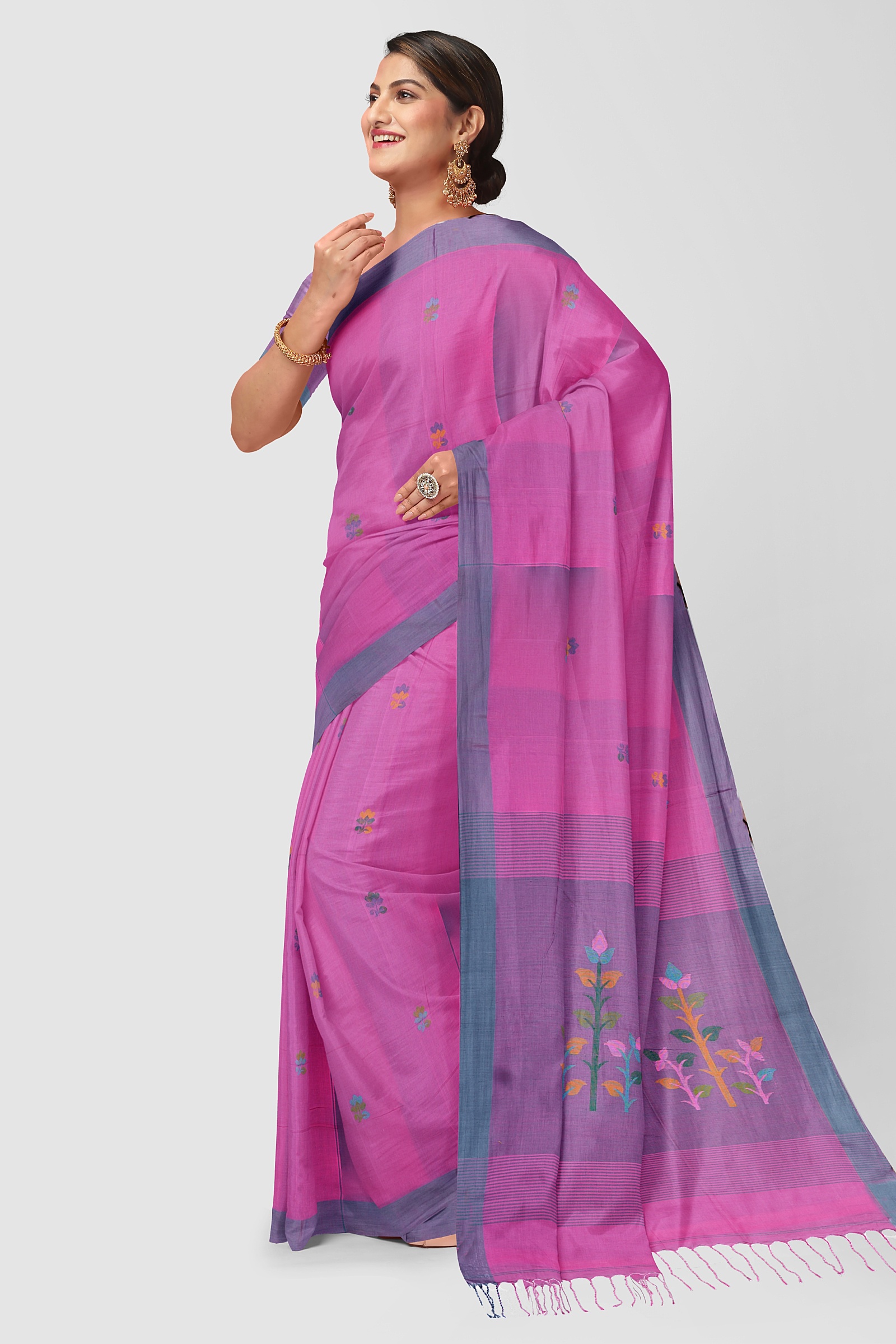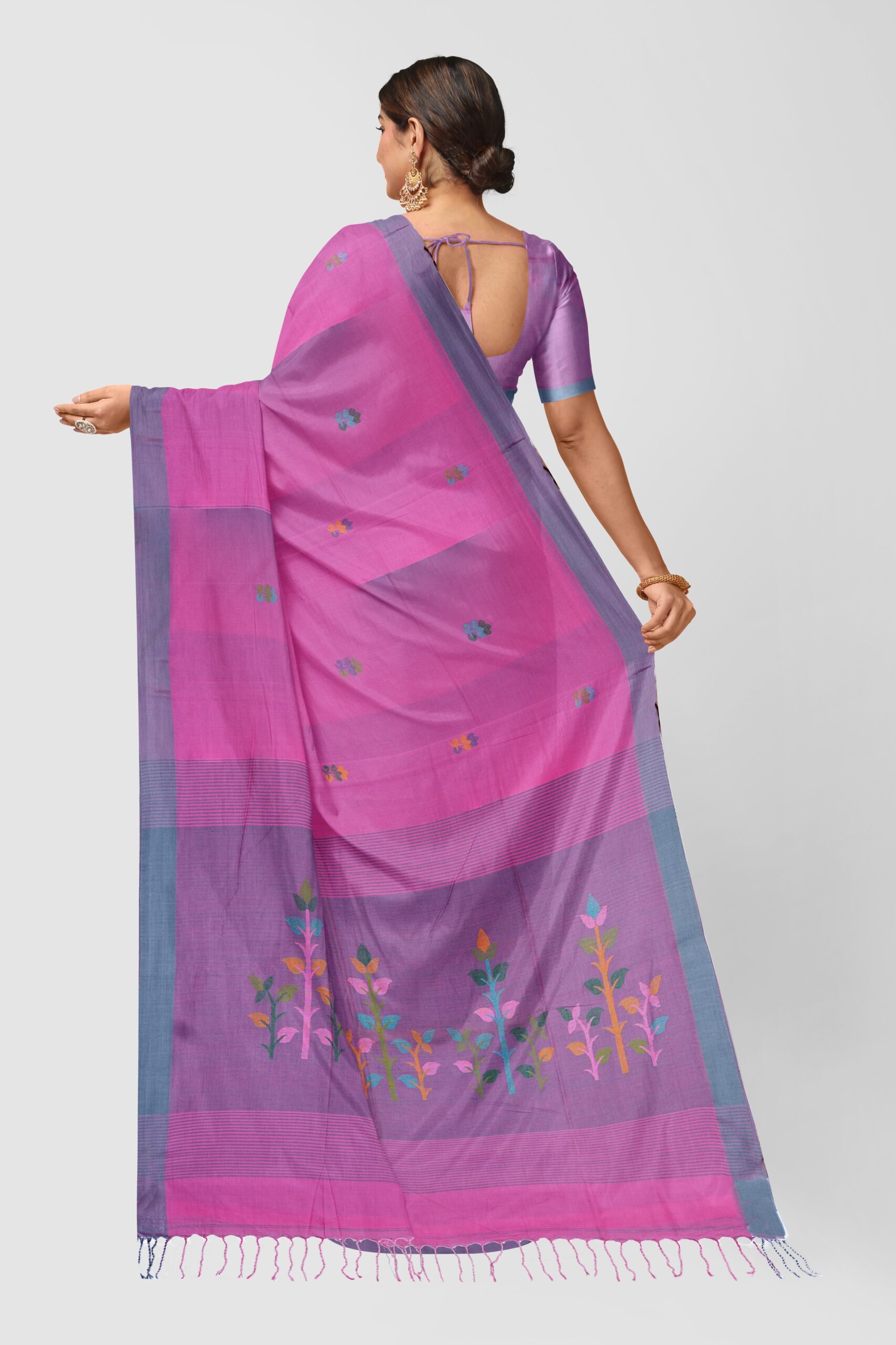 We believe in the power of purity, which is why this saree is woven from 100% cotton. This natural fabric allows your skin to breathe, making it the ultimate choice for comfort during long days or summer gatherings. The fabric creates a graceful silhouette that is manageable for beginners and saree connoisseurs alike.