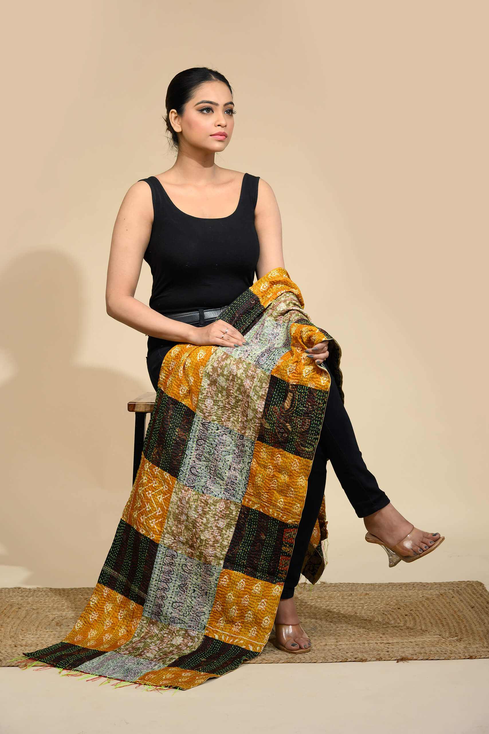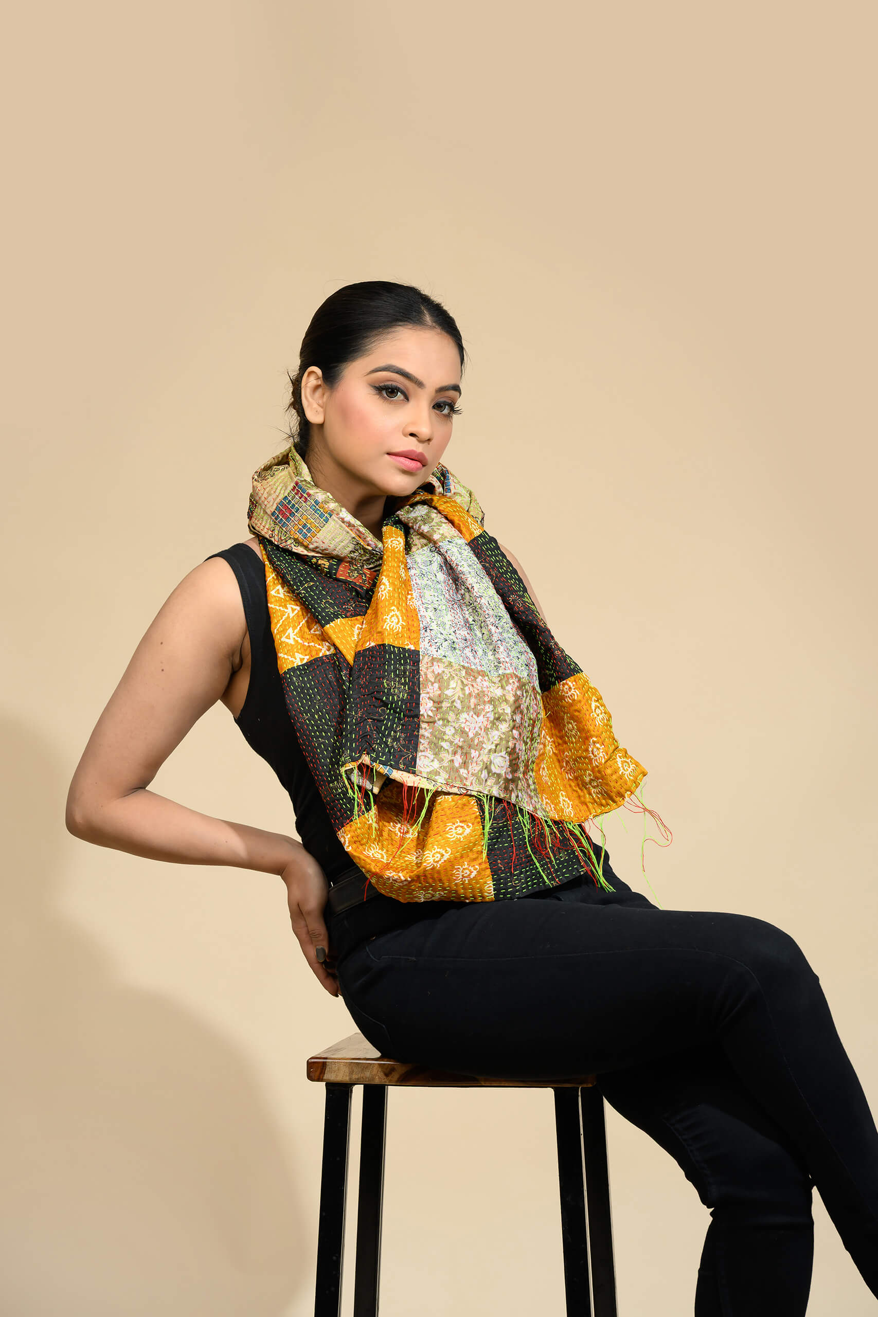 Because of its vibrant patchwork design, the scarf is perfect for cultural events, festive occasions, and everyday fashion. In addition, the handcrafted kantha stitch adds authenticity and artistic charm that machine-made fabrics cannot replicate.